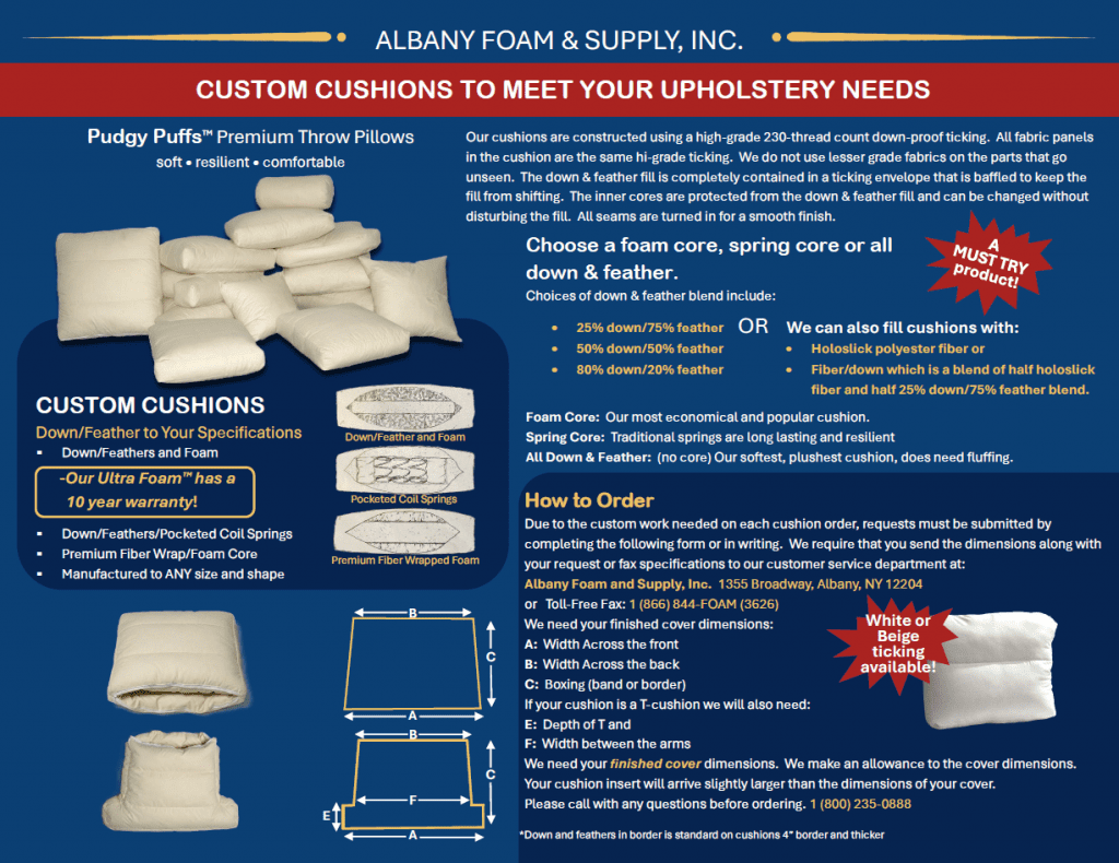 Due to the custom work needed on each cushion order, requests for down cushions must be submitted via the form below. We require that you mail templates or fax (Toll-free fax 1(866)844-3626) your down cushion sketches with dimensions and specifications to our customer service department.