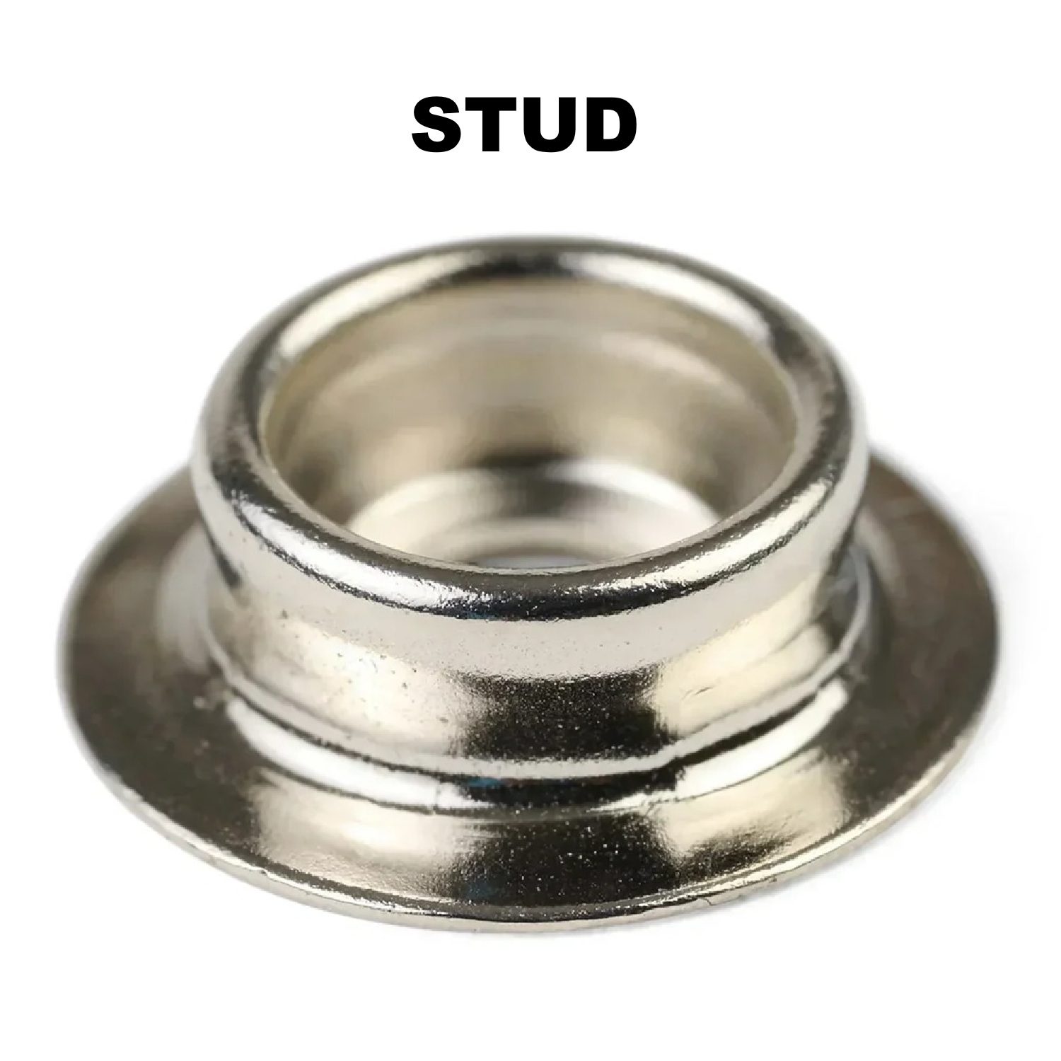 Studs are a heavy-duty, self-piercing fastener, made from nickel-plated brass. They are designed for use in marine and industrial applications, such as boat covers, tents and upholstery. The stud works with an eyelet to connect multiple layers of fabric.