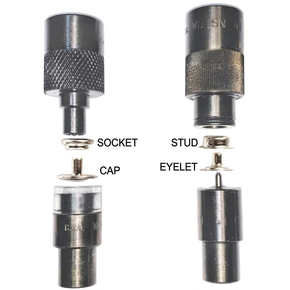 This is a set of specialized tools used with a button machine (1507019A) to install various fasteners like snaps, grommets, rivets and other hardware onto materials such as fabric, leather or vinyl. The dies are designed to work together with specific sets for different fastener types and sizes, to create a secure connection in one or more steps.